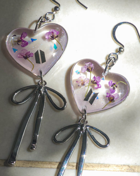 Heart-shaped earrings with bow inspired by BTS 🌸 silver color