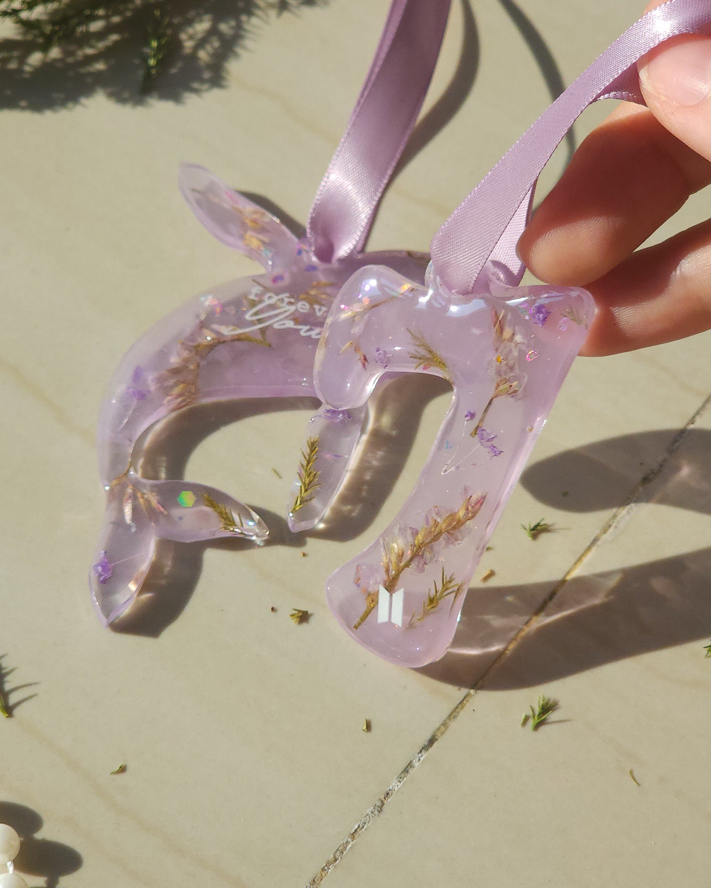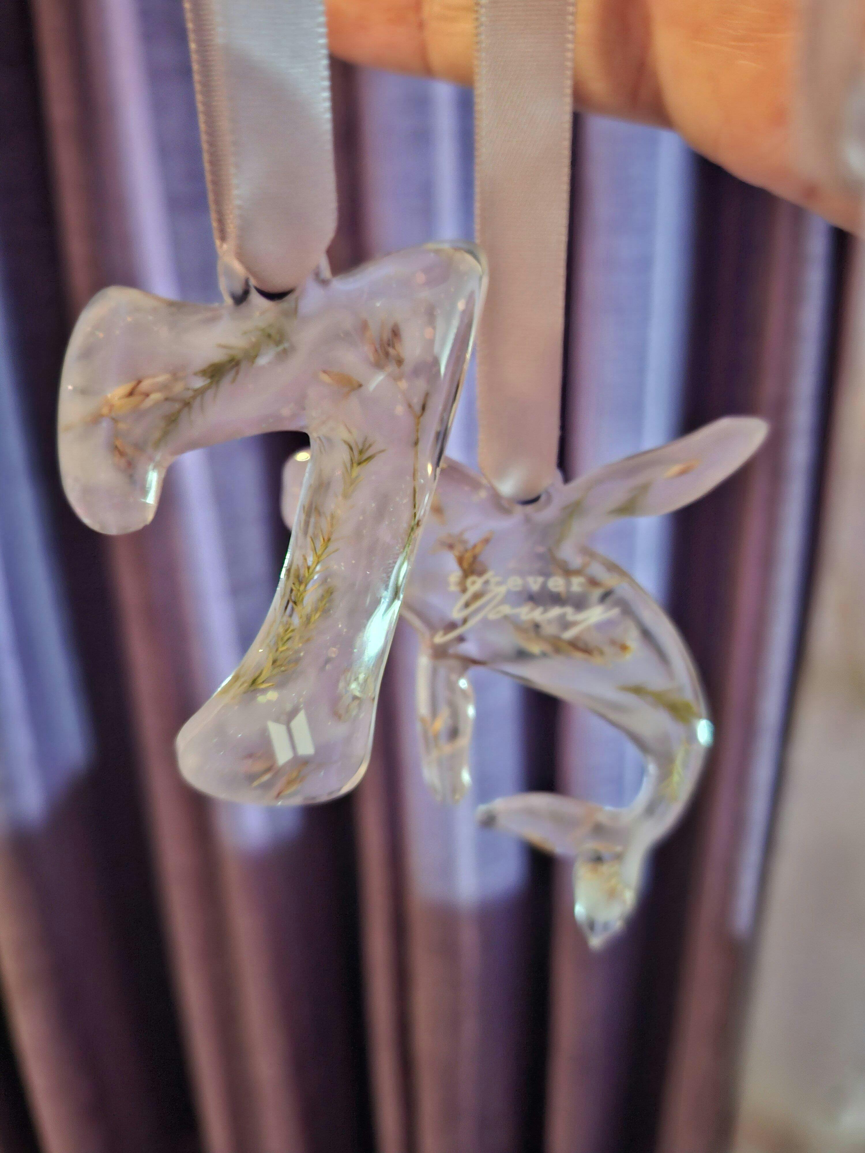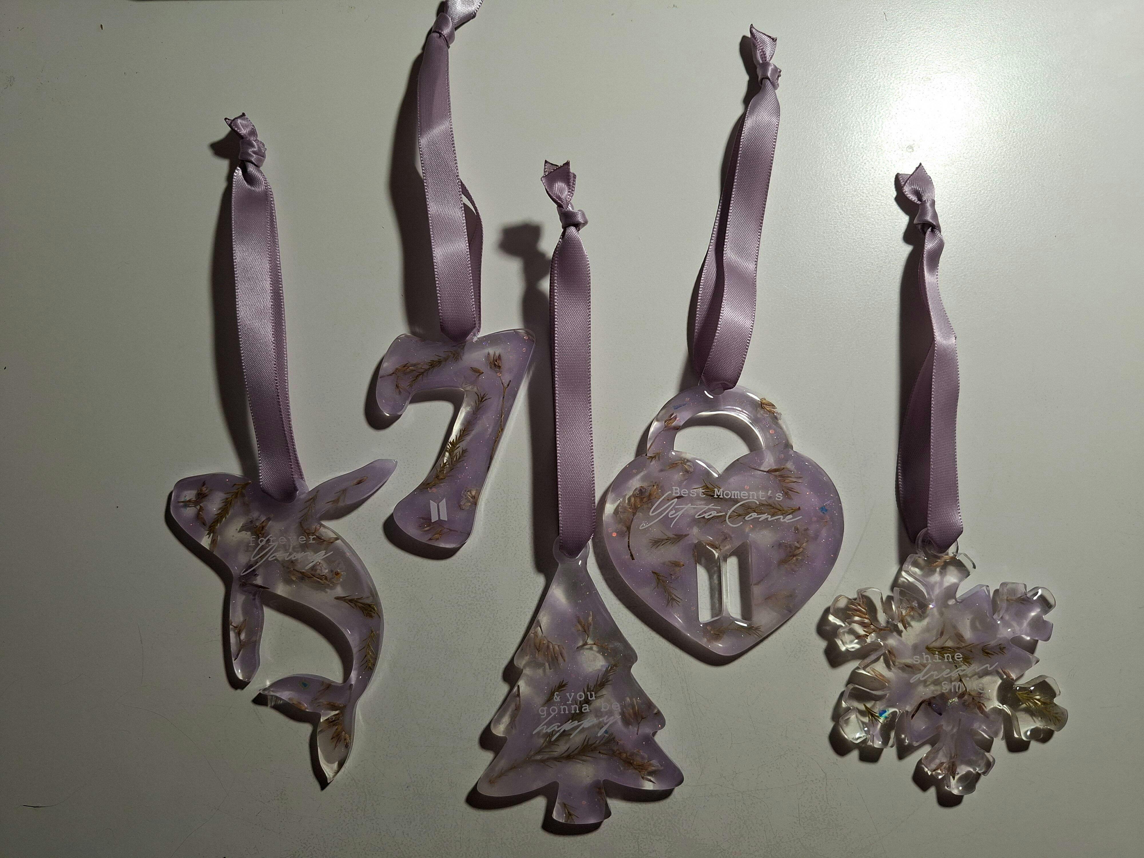 A delicate set of five handcrafted ornaments filled with preserved flowers, capturing soft colors and the beauty of nature inside. Inspired by BTS & ARMY 🤍