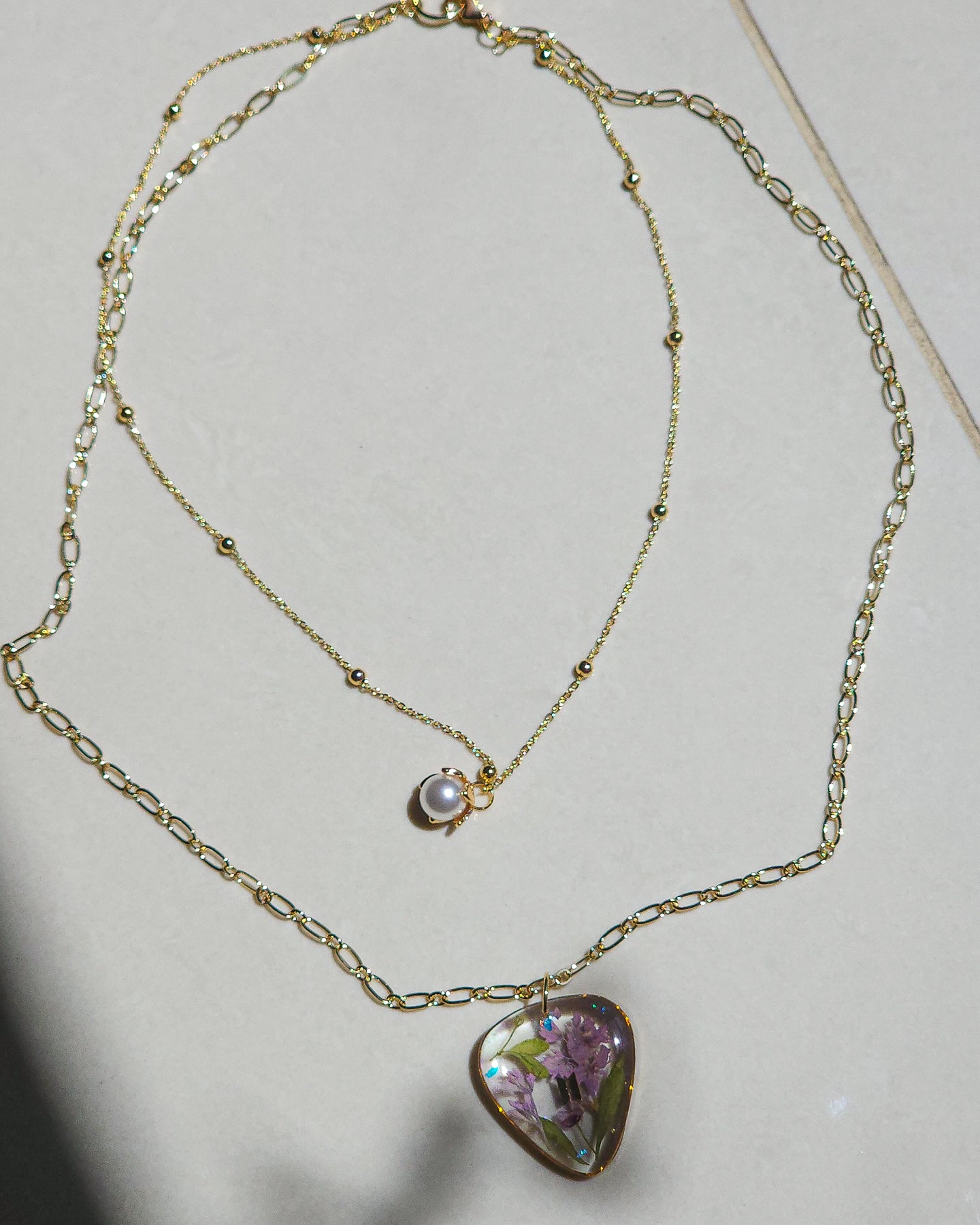 A delicate two-layered chain with a unique and very feminine design. The guitar pick pendant holds a miniature garden of wildflowers and leaves, paired with a randomly chosen charm β€” either a delicate butterfly or a charming pearl, inspired by BTS aesthetics 🌷