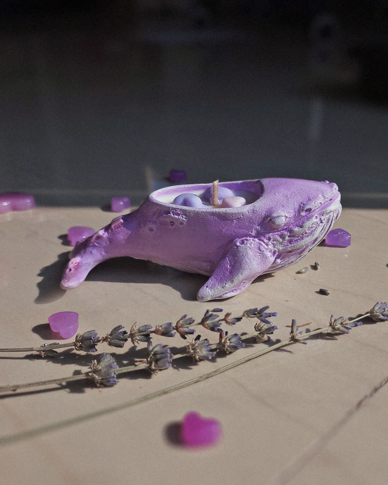 Inspired by the gentle BTS & ARMY aesthetic, this small whale-shaped candle is handcrafted from start to finish. I sculpted the original whale model manually, cast it in eco resin, then sanded, painted, and sealed it with a heat-resistant varnish. The soft purple color palette is inspired by the Love Yourself era, giving the piece a calm and dreamy look.