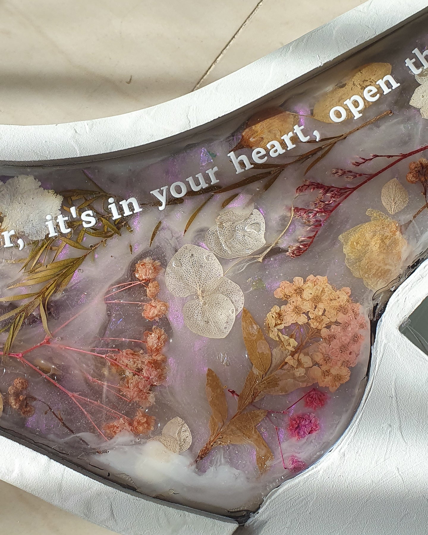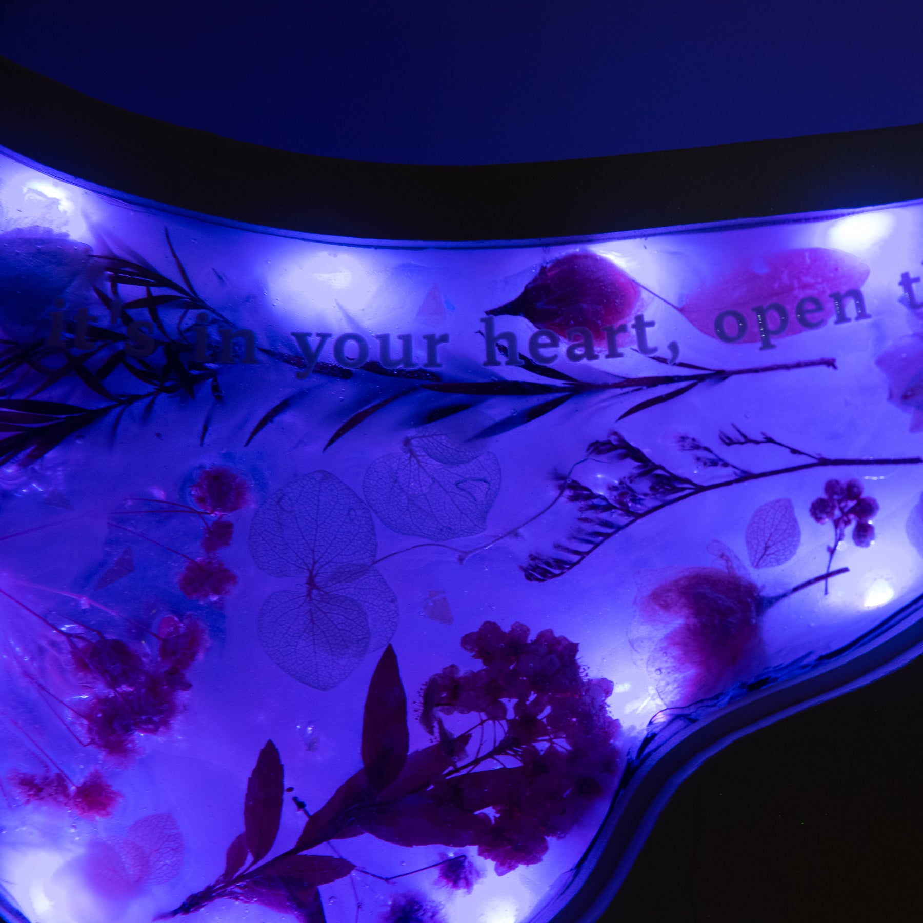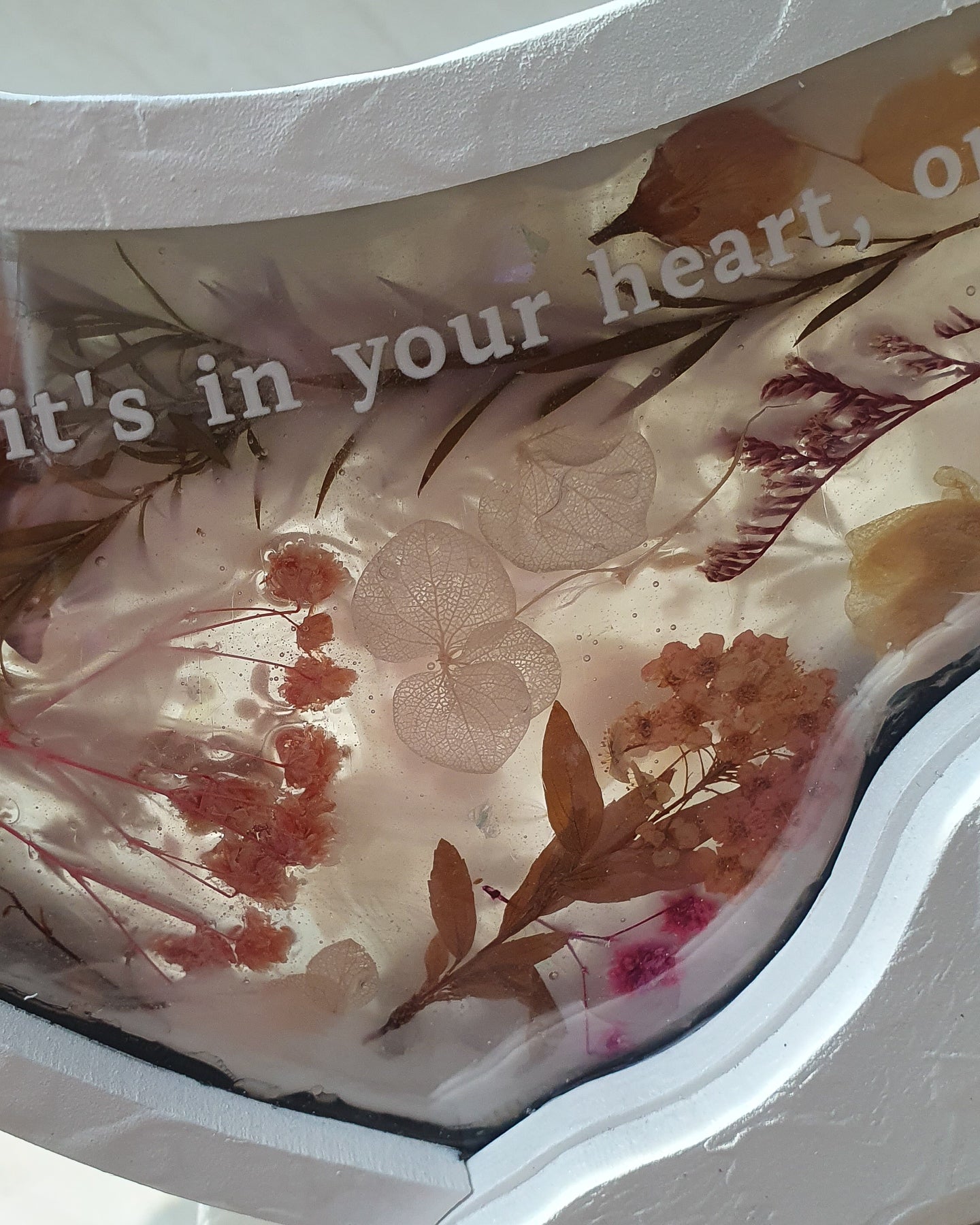 Inside are real dried wildflowers, carefully preserved, making each piece truly one of a kind. The lamp features RGB lighting controlled by a remote, allowing you to change colors and create different moods. Powered by 3 AA batteries.