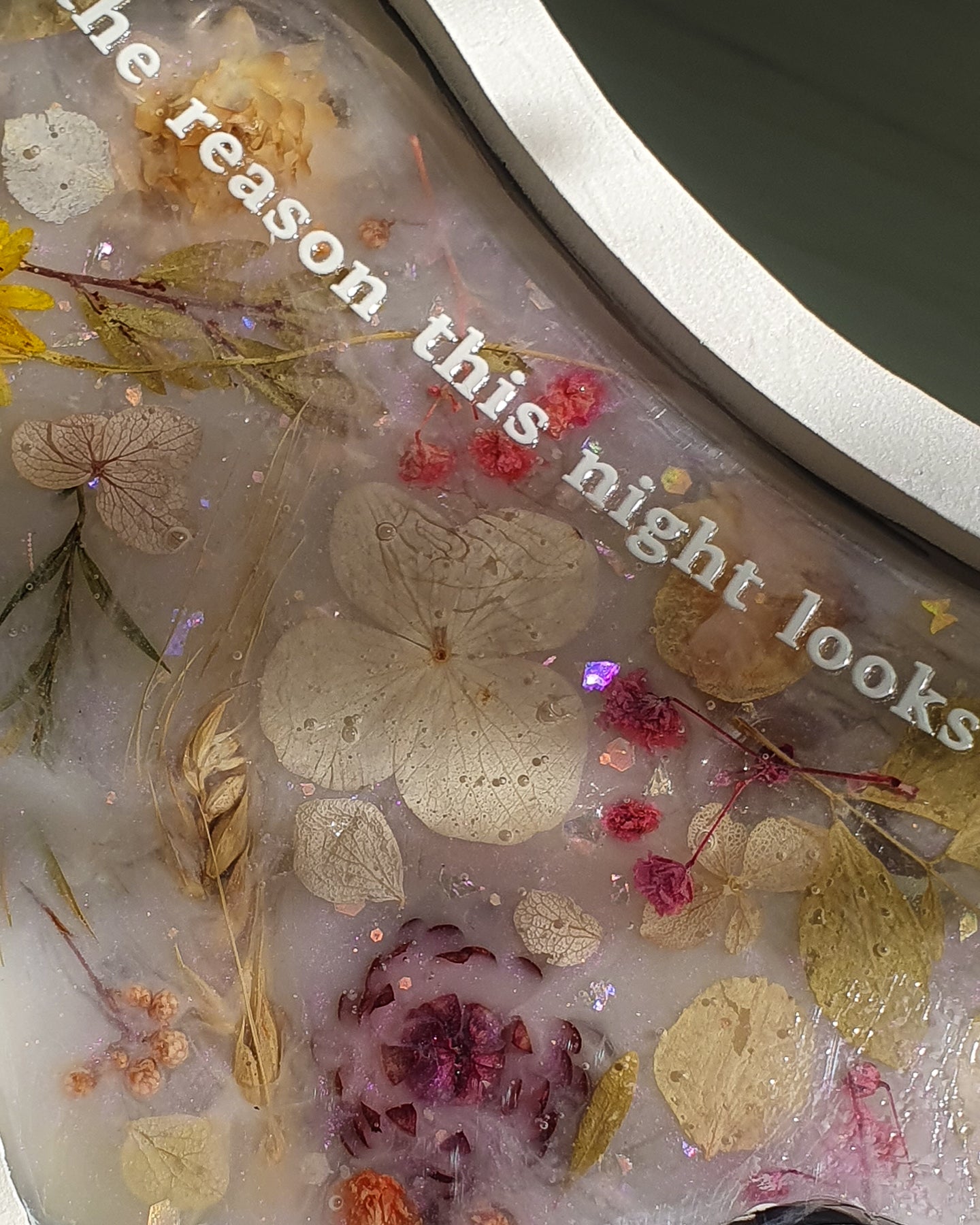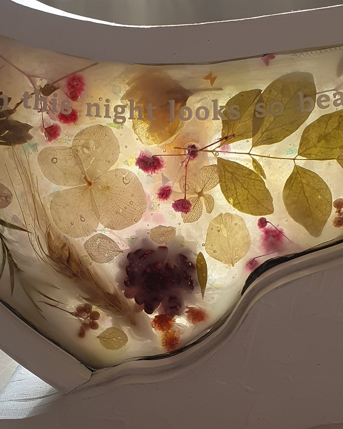 Inside are real dried wildflowers, carefully preserved, making each piece truly one of a kind. The lamp features RGB lighting controlled by a remote, allowing you to change colors and create different moods. Powered by 3 AA batteries.
